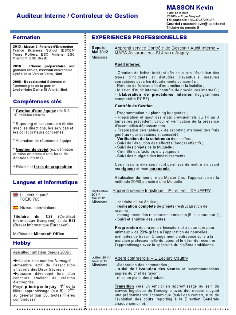 Lélément qui devrait être le plus valorisant votre mastère spécialisé contrôle de gestion est mis en avant dune manière telle quil fait de vous une jeune diplômée et ruine la valeur ajoutée de la période de 12 ans précédant ce diplôme 2000 2012. Visualisez le cv de x contrôleur de gestion en pdf.