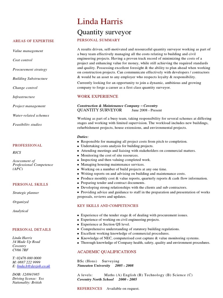 Although it gives a comprehensive overview of the candidates industry skills and experience the organised structure means its not overwhelming or difficult to read. Email protected current job. Quantity surveyor cv format. Cv quantity surveyor sample job description duties personal skills resume created date. My ambition is to find an opportunity that will allow me to fulfill my skillset and stretch it further while building my career. The following quantity surveyor cv examples will help you choose the right resume.