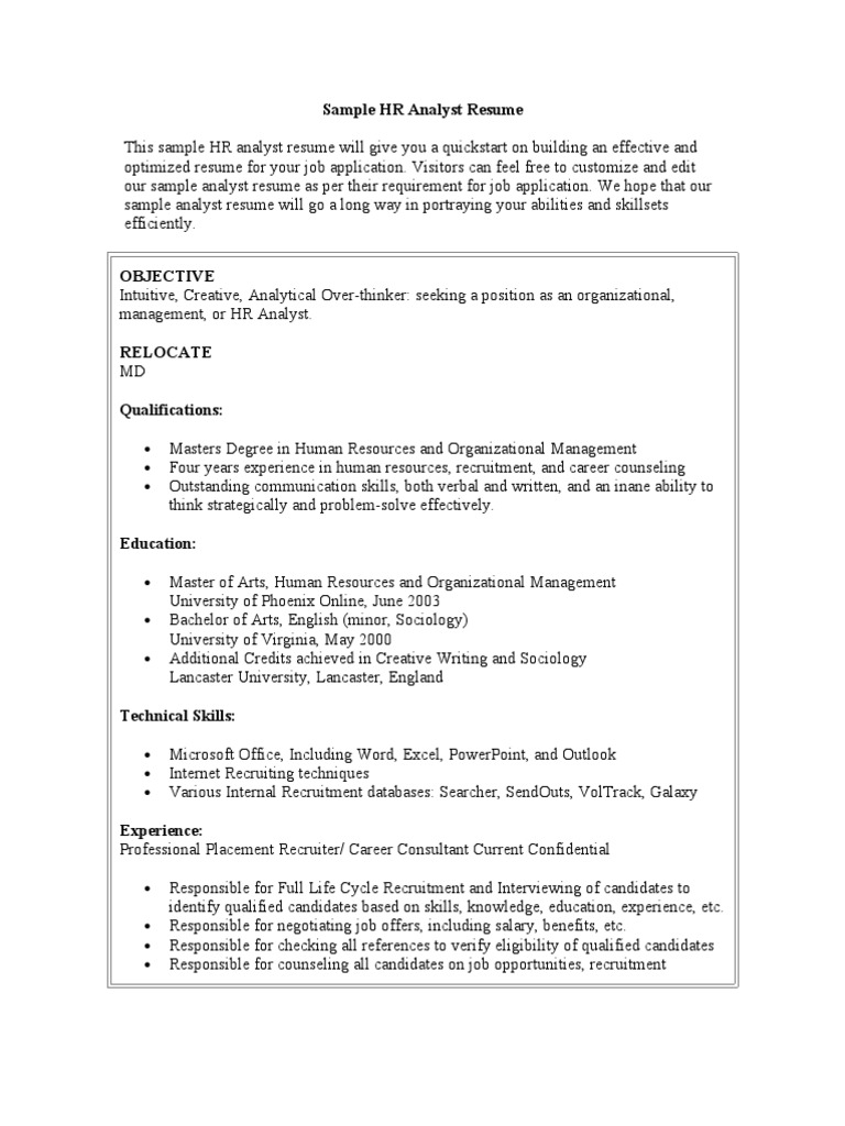 Easy going by nature and able to get along with both work colleagues and senior managers when providing comprehensive administrative support to day to day operations of human resources department. A waitress might start out with the description took customer orders and delivered food but a quantified description saying served customers in an upscale 100 seat restaurant provides much more insight. She needs someone who can support her right away. Get inspiration for your job search and an edge in landing the job you want by checking out this sample resume for a human resources professional. Human resources job description. Nearly any description for any job can be enhanced through the use of numbers.