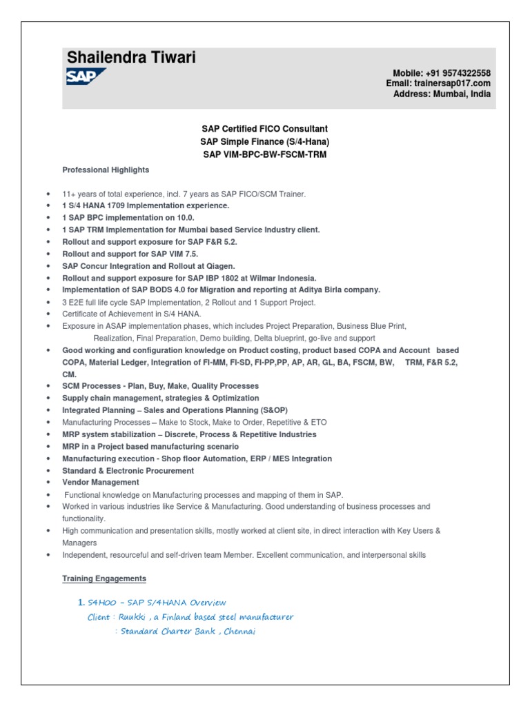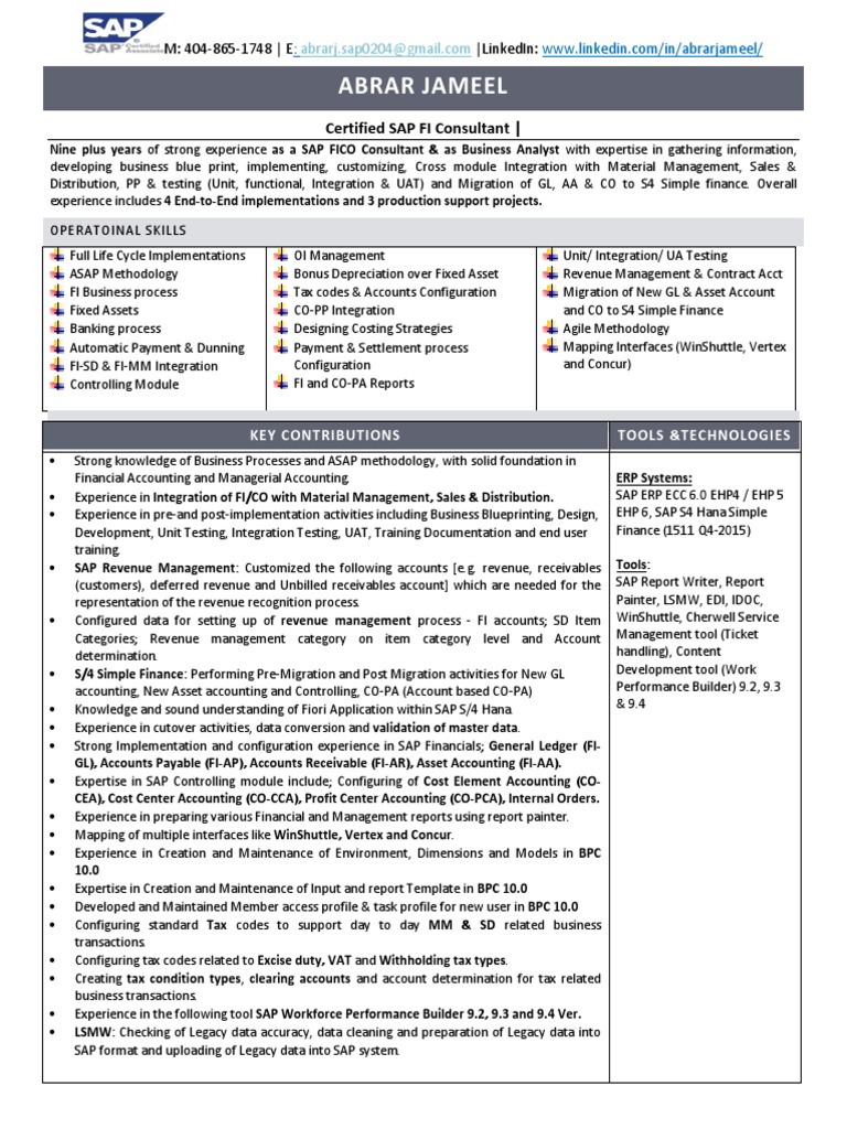 Create a unique sap resumecvdoes your sap resume suckdid you just search for a. Sap s4hana fico consultant resume in pembroke pines fl february 2017. 4 sap fico consultant.