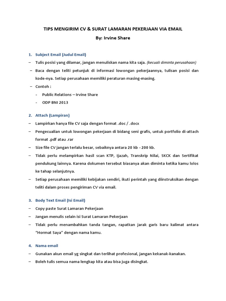 Karena email yang masuk tidak hanya milik anda ada banyak saingan yang juga memperebutkan posisi yang sama. Dalam urusan melamar kerja cv curriculum vitae merupakan hal yang sangat vital bagi para pelamar kerja untuk masuk ke tahapan seleksi kerja berikutnya. Jangan berpikir bahwa ketika anda mengirim lamaran cv via email maka akan langsung mendapat respon dari hrd. Tips mengirim lamaran via email ketika kamu diminta untuk mengirim lamaran melalui email ada beberapa hal yang harus kamu perhatikan supaya lamaranmu mudah diakses oleh hrd dan pastinya akan membuat lamaran kamu di notice daripada lamaran lain yang tidak memperhatikan hal hal di bawah ini. 10 tips sukses wawancara kerja atau interview kerja untuk para fresh graduate. Subjek email yang tepat cara membuat cv online yang perlu diperhatikan adalah memasukkan subjek email.